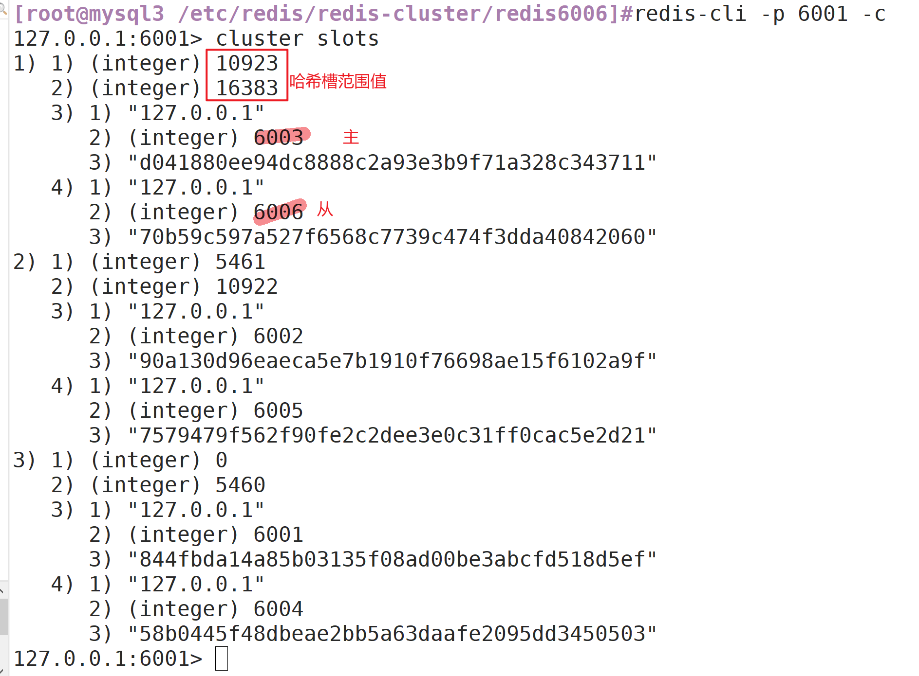 127.0.0.1:6001> cluster slots #查看节点的哈希槽编号范围