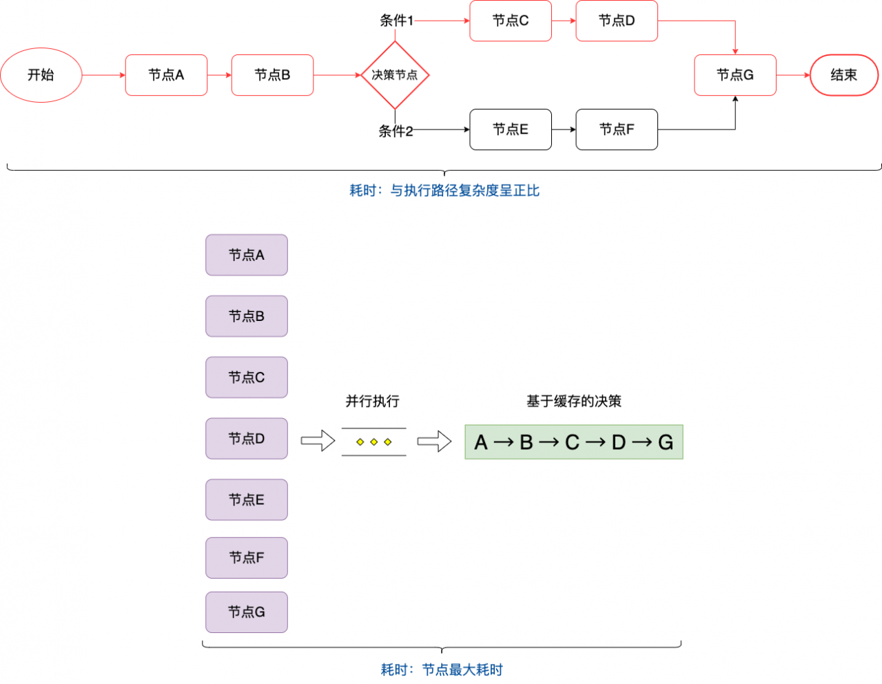 此阶段就像一个工作审批流,从开始节点一步一步的往下串行执行,直到终点。决策过程中,完全依赖节点路径的复杂度,假设一个节点的平均耗时为 100ms,那么如下红色执行路径需要耗时 500ms。