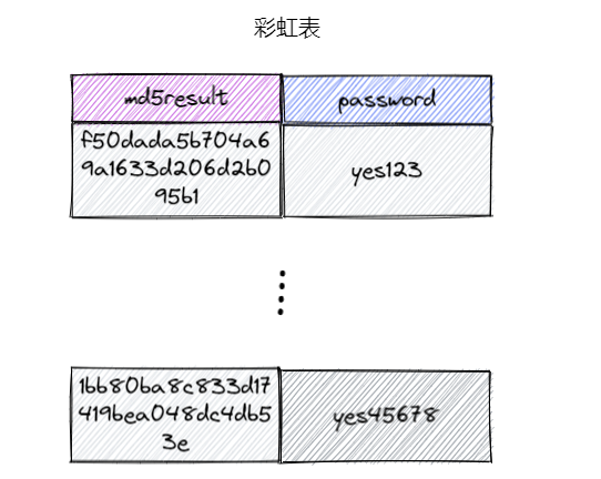 彩虹表:是用于加密散列函数逆运算的预先计算好的表,常用于破解加密过的密码散列(维基百科)