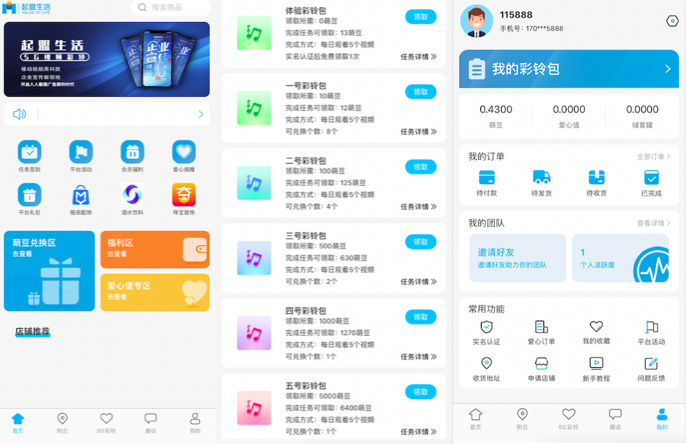 起盟生活APP免费注册,实名认证,获取彩铃包,每日完成任务获取萌豆,分享获得10%萌豆加速释放,晋升达人加速释放。起盟生活系统开发源码交付,欢迎和李铁牛探讨,15889726201.