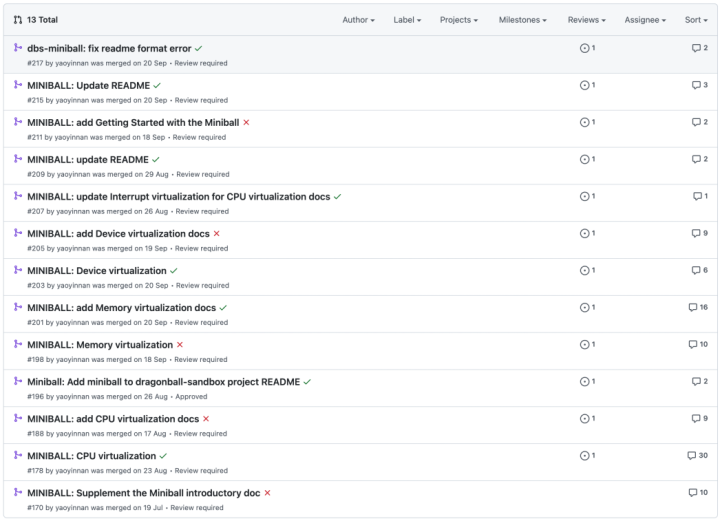 (图/MiniBall 项目完成过程中一共提交合并了 13 个 PRs,涵盖 CPU 虚拟化、内存虚拟化、设备虚拟化、架构文档和使用指南等多项内容)